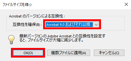 Acrobatのバージョンによる互換性:互換性を確保を選択し、OKをクリック。